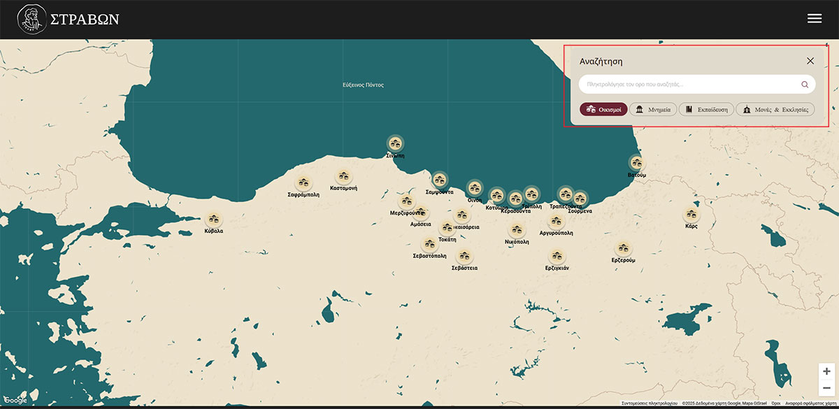 Στον χάρτη υπάρχουν διάφορα σημεία ενδιαφέροντος που σχετίζονται με την ιστορία και τον πολιτισμό του Πόντου. Για να διευκολυνθεί η πλοήγησή σας, μπορείτε να φιλτράρετε τα σημεία ανά κατηγορία.