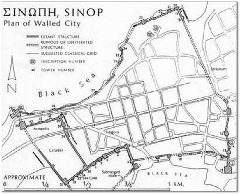 Η Σινώπη ιδρύθηκε από αποίκους της Μιλήτου τον 7ο αιώνα π.Χ., ενώ μικρότερος ελληνικός οικισμός φαίνεται πως υπήρχε εκεί ήδη από τον 8ο αιώνα π.Χ. Περιβάλλεται από οχυρωματικό τείχος, ενώ τειχισμένη είναι και η ακρόπολη, όπου εντοπίζεται η αρχική εγκατάσταση των πρώτων αποίκων.